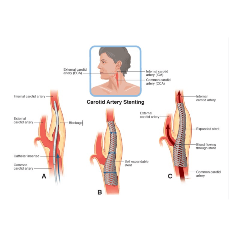 Carotid artery stenting addresses narrowing or blockage of the carotid arteries, which supply blood to the brain. This procedure involves placing a stent to widen the artery, ensuring uninterrupted blood flow and significantly reducing the risk of stroke.